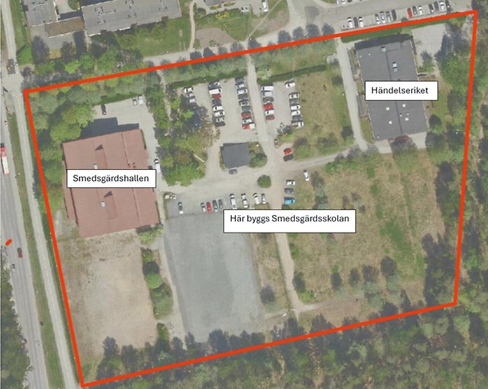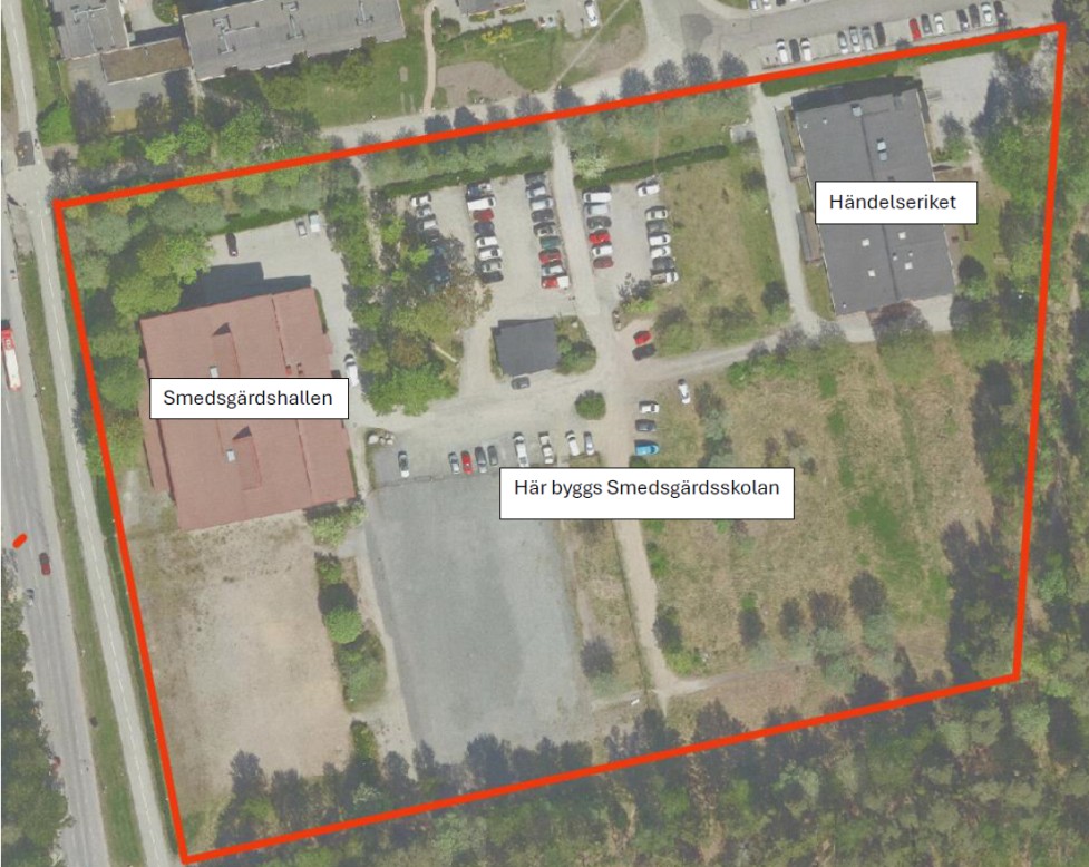 På platsen där skolan ska byggas finns idag en idrottshall, Smedsgärdshallen och en lokal för daglig verksamhet inom LSS, Händelseriket. Utöver bygget av skolan och en ny skolgård byggs bland annat ett mindre förråd i Smedsgärdshallen samt byte av fönster i Händelseriket. Smedsgärdshallen och Händelseriket ska hållas i drift under hela byggtiden och deras verksamheter kommer inte avbrytas.