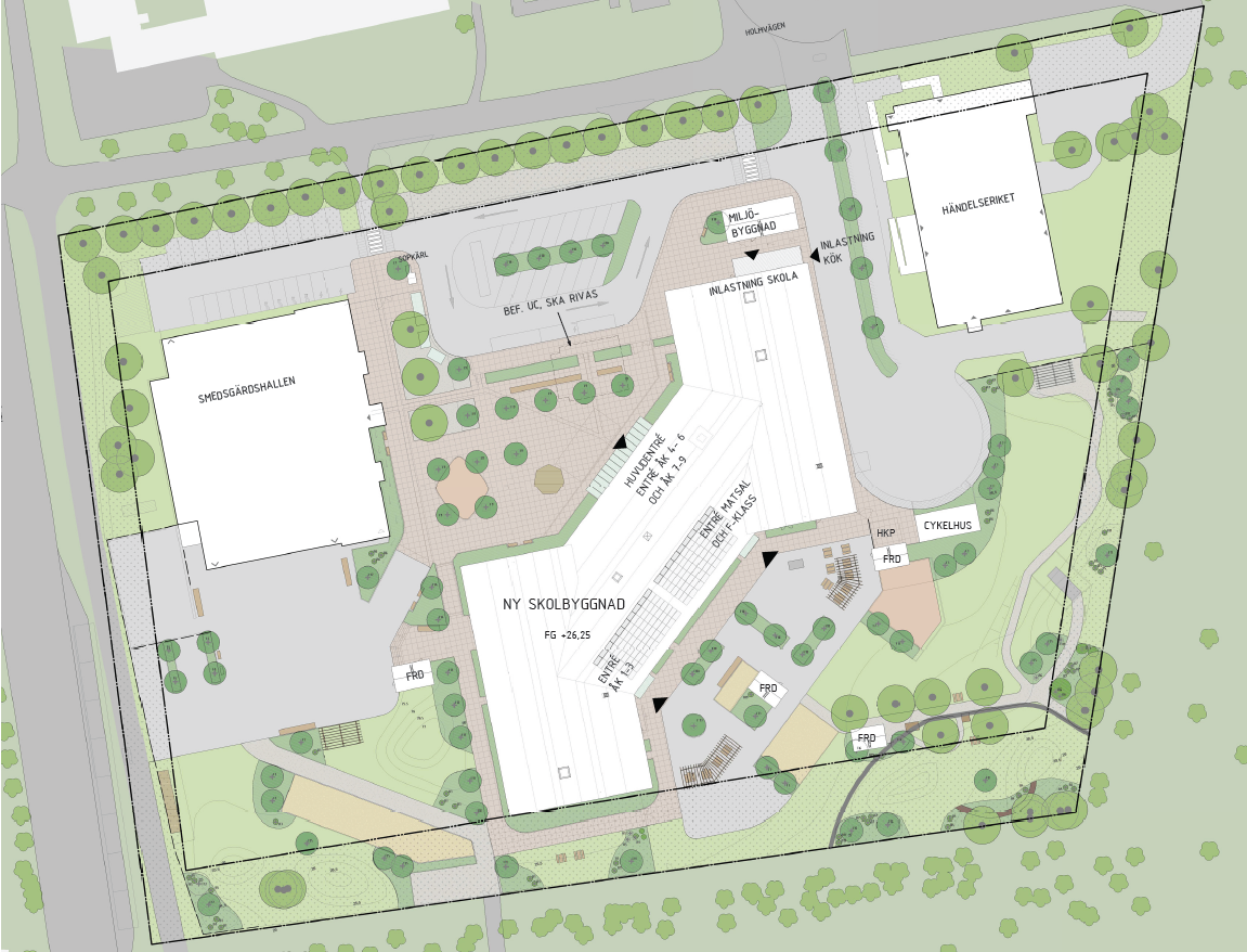 - ett torg att skapas mellan den befintliga idrottshallen och den nya skolbyggnaden.