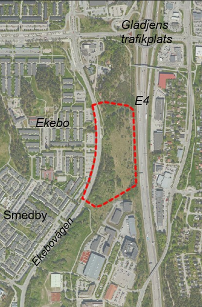 Området ligger sydväst om trafikplats Glädjen, mellan Ekebovägen och E4:an.