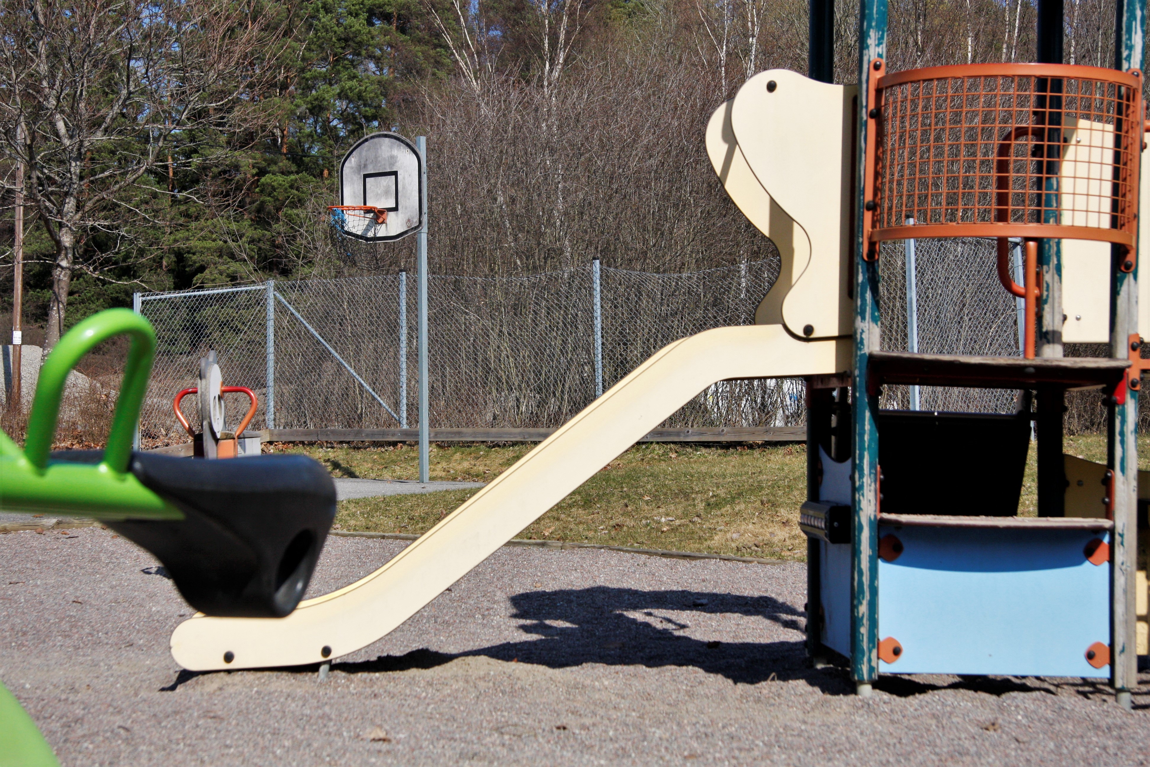Gungor, pendelgunga, klätterställning, rutschbana, balansgång, korggunga, piruetter, bänkar och bord.