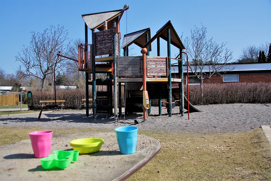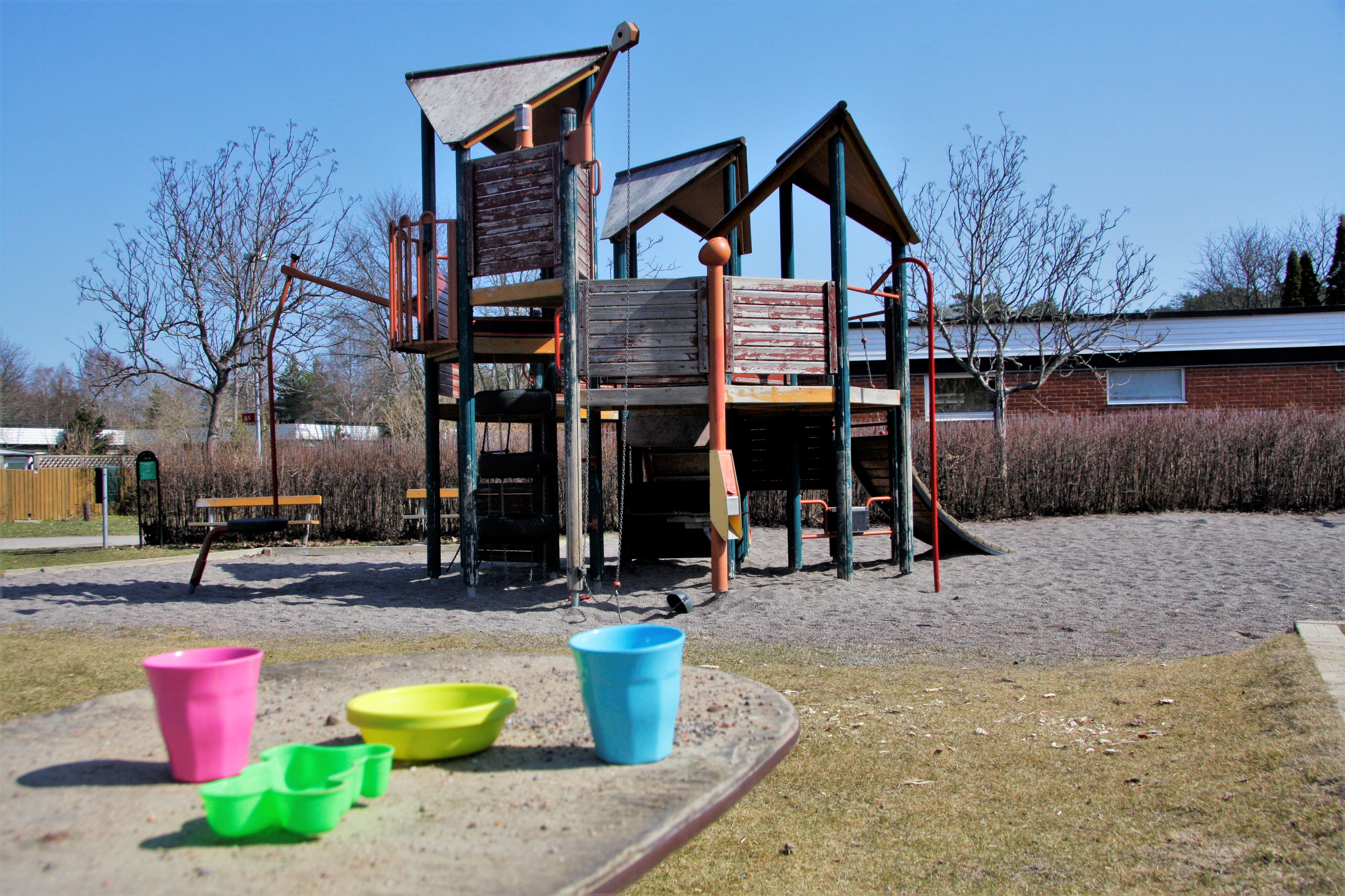 Gungor, sandlåda, pendelgunga, stor klätterställning, rutschbana, balansgång, lekhus, bänkar och bord.