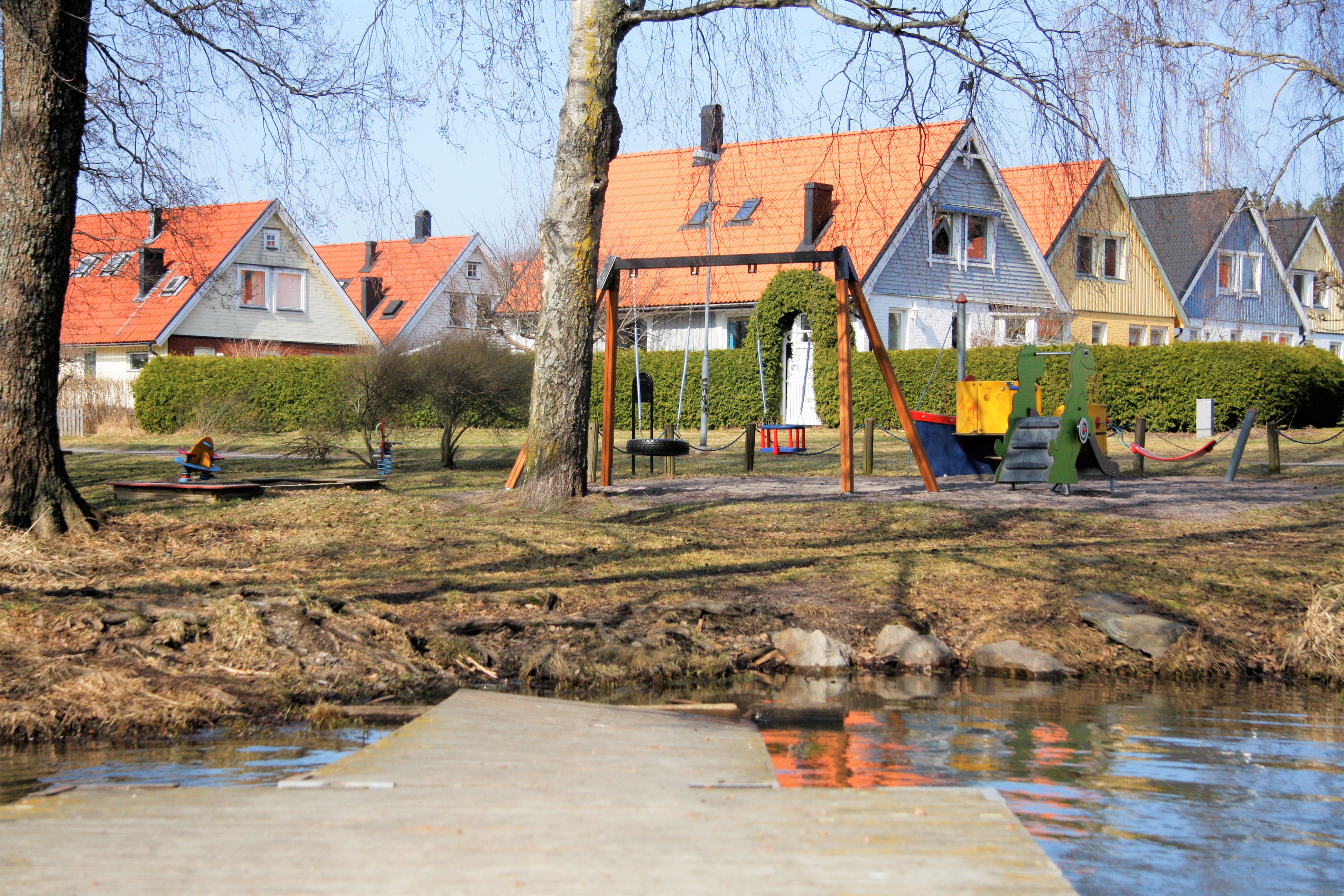 Nära vatten, bad och brygga. Gräsytor intill lekplatsen.