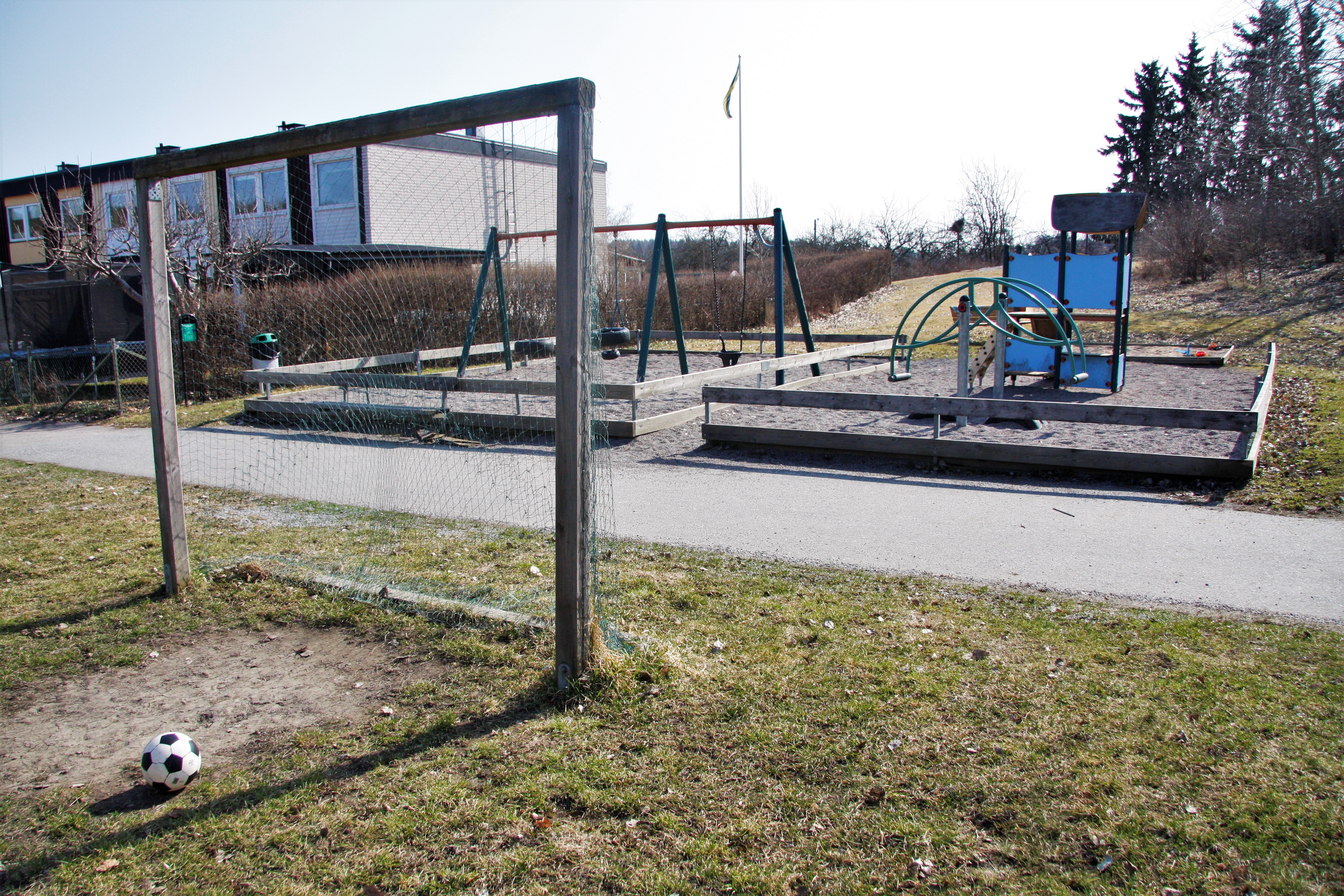 Gungor, sandlåda, pendelgunga, rutschbana, lekhus och bänkar.