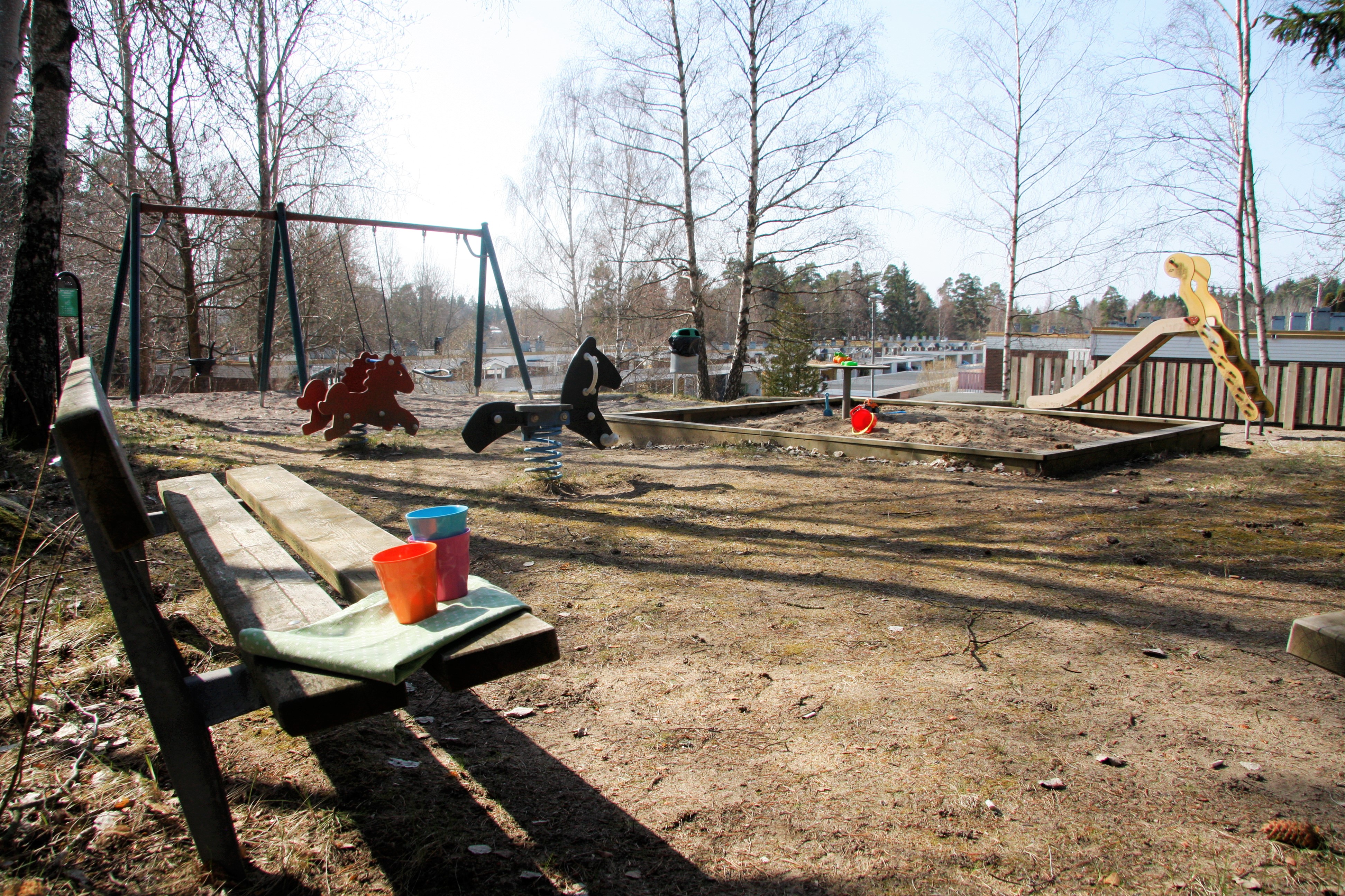 Gungor, sandlåda, pendelgunga, rutschbana och bänkar.